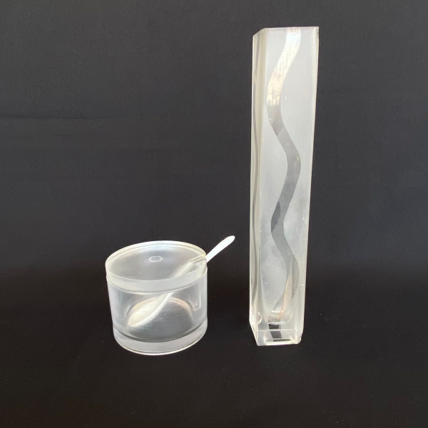 • Lote com 2 (duas) peças sendo: Um açucareiro acrílico grosso com colher de porcelana branca (com bicado); E um vaso para flores quadrado de vidro (possui bicados). Med.: 7cm de altura e 9cm de diâmetro; e 25cm de altura e 4cm de largura.