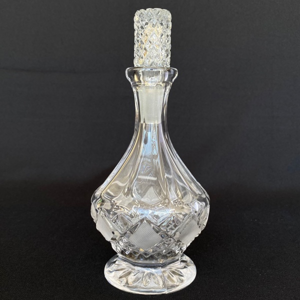 • Garrafa de cristal bojuda prensada com desenhos geométricos. Med.: 17cm de altura. Tampa adaptada