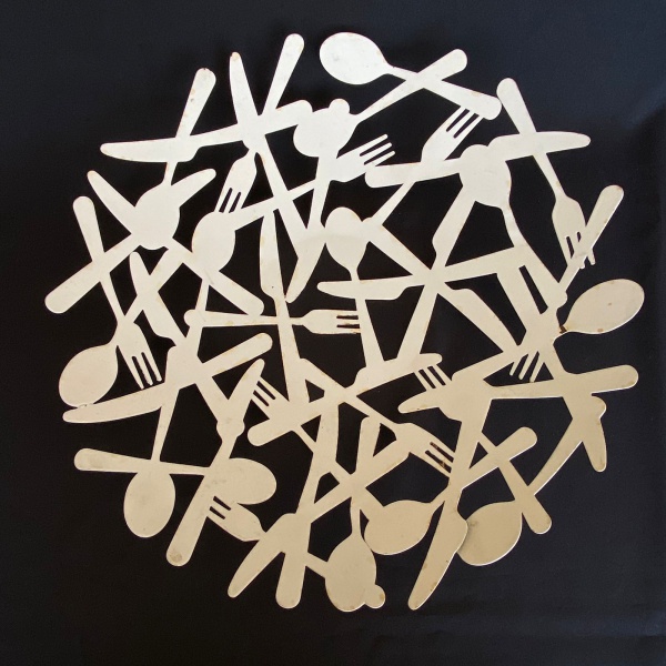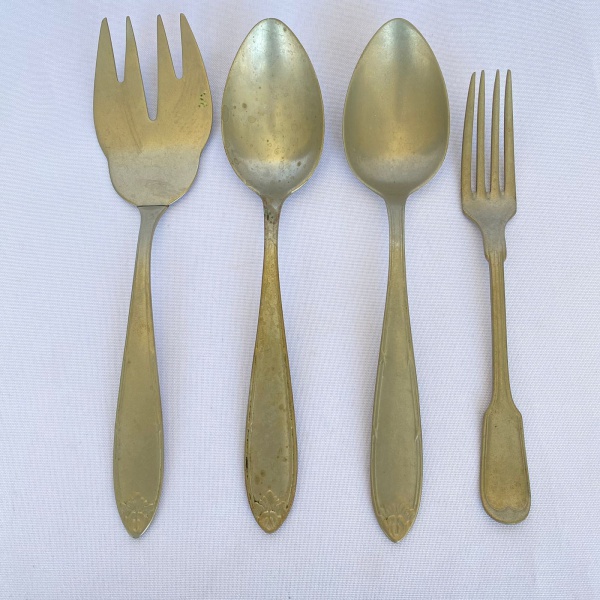 • ALPACCA - Lote com quatro talheres vintage da década de 30 a 50 sendo duas colheres, um garfo e um garfo para salada. Maior med.: 20cm.