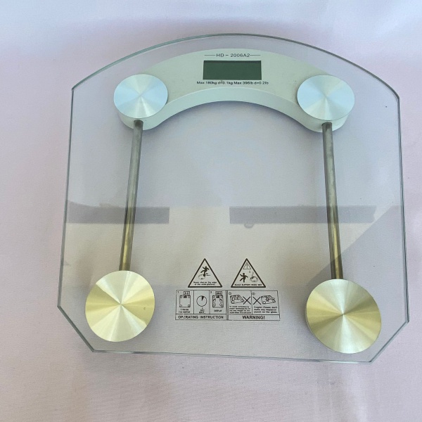 • Balança digital corporal de vidro. Med.: 4cm de altura e 32cm de largura. Peso máximo de 180kg. Não testado.