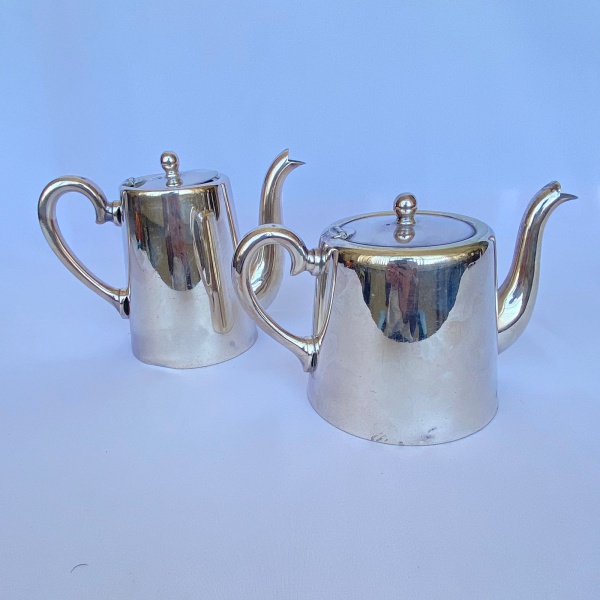 • FRACALANZA - Bule e chaleira em metal espessurado à prata, alça em voluta e pegador em bola, med. 12cm e 13cm. Apresenta pouco amassados