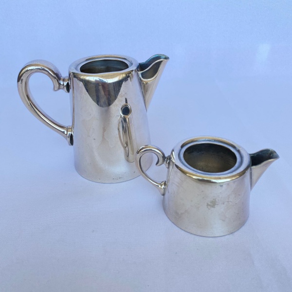 • FRACALANZA - Leiteira e cremeira em metal espessurado à prata, alça em voluta, sem tampas med. 10cm e 5cm. Apresenta pouco amassados