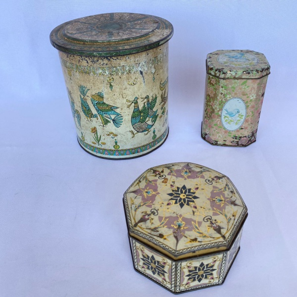 • MEISTER - Lote com 3 (três) antigas latas sendo: 1 para biscoitos, med. 17,5cm de altura e 17cm de diâmetro e 2 para chá, med. 7cm e 12,5cm de altura.