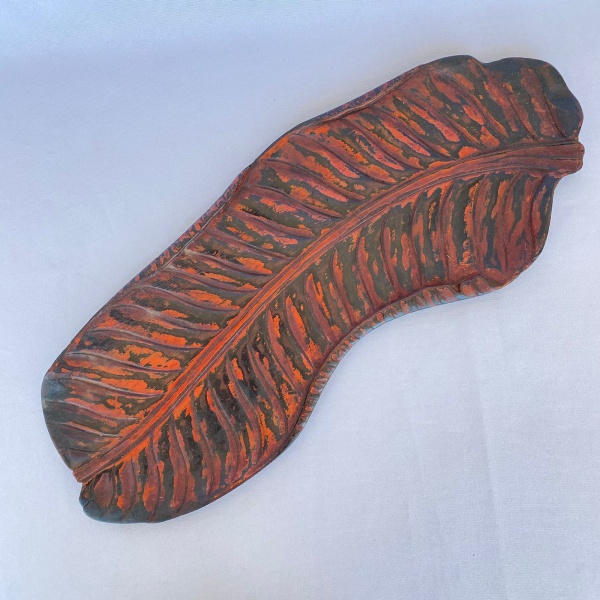 • Antiga bandeja em madeira pintada na cor preta no formato de folha patinada em vermelho, med. 41X15cm