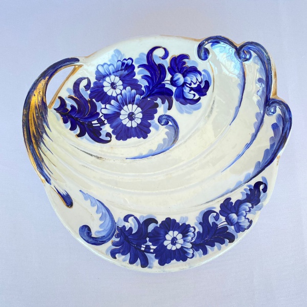 • ZAPPI S/A - Fruteira em porcelana decorada com flores, volutas em relevo, em tons de azul e dourado, med. 24cm de diâmetro. Apresenta desgaste no dourado e bicado na borda