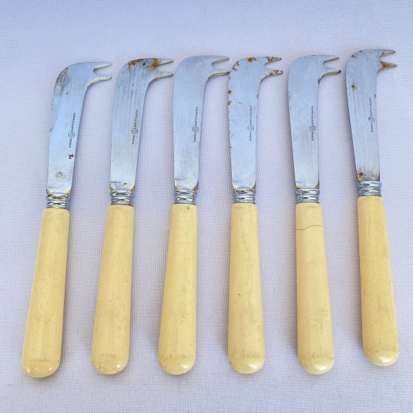 • HERCULES - Conjunto com 6 (seis) facas para queijo em aço inox com cabo de plástico em creme. Med.: 15cm. Apresenta pontos de oxidação e um com rachadura.