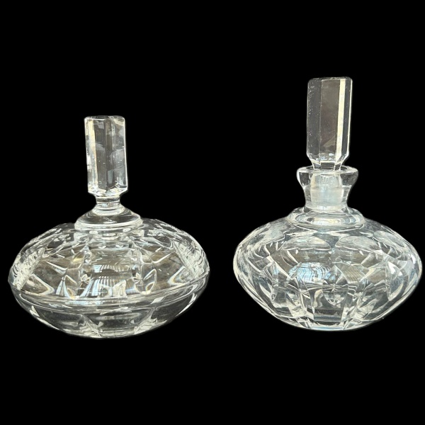 • Conjunto de Toalete com duas peças em cristal europeu sendo um perfumeiro e um pote com tampa, decorados com geométricos e pegadores canelados, med. 12,5cm e 14cm de altura.