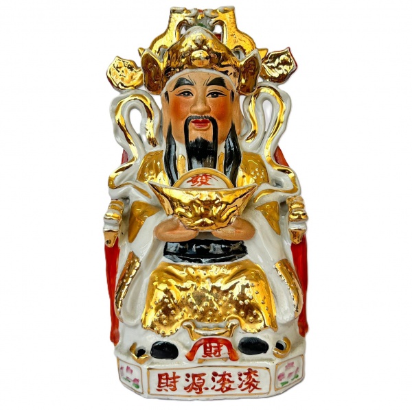 • Escultura Cai-Shen Deus da Fortuna, Prosperidade e Dinheiro, em porcelana com policromia e dourado, med. 26,5cm de altura.