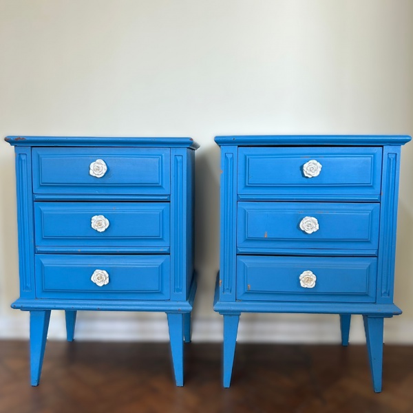 • Par de mesas de cabeceiras em madeira pintadas na cor azul com 3 gavetas em almofadas e puxadores em formato de rosas na cor branca, apoiadas em 4 pés. Med. 70X55X40cm  (A.C.L.)
